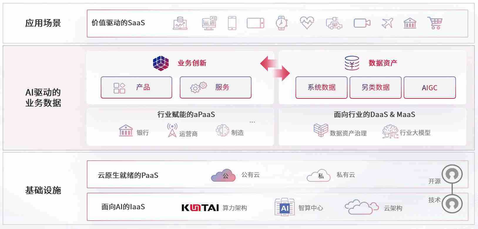 数字时代,,围绕企业数字化转型的关键要素,,,尊龙旗舰厅数码开创性的提出数云融合战略和技术体系框架,,着力在云原生、、、数字原生、、AI原生和信创产业上架构产品和服务能力,,为处在不同数字化转型阶段的快消零售、、、汽车、、金融、、、、医疗、、、政企、、、、教育、、、、运营商等行业客户提供泛在的敏捷IT能力和融合的数据驱动能力,,,构建跨界融合创新的数字业务场景和新业务模式,,,,助力企业级客户建立面向未来的核心能力和竞争优势,,全面推动社会的数字化、、、智能化转型升级。。。。