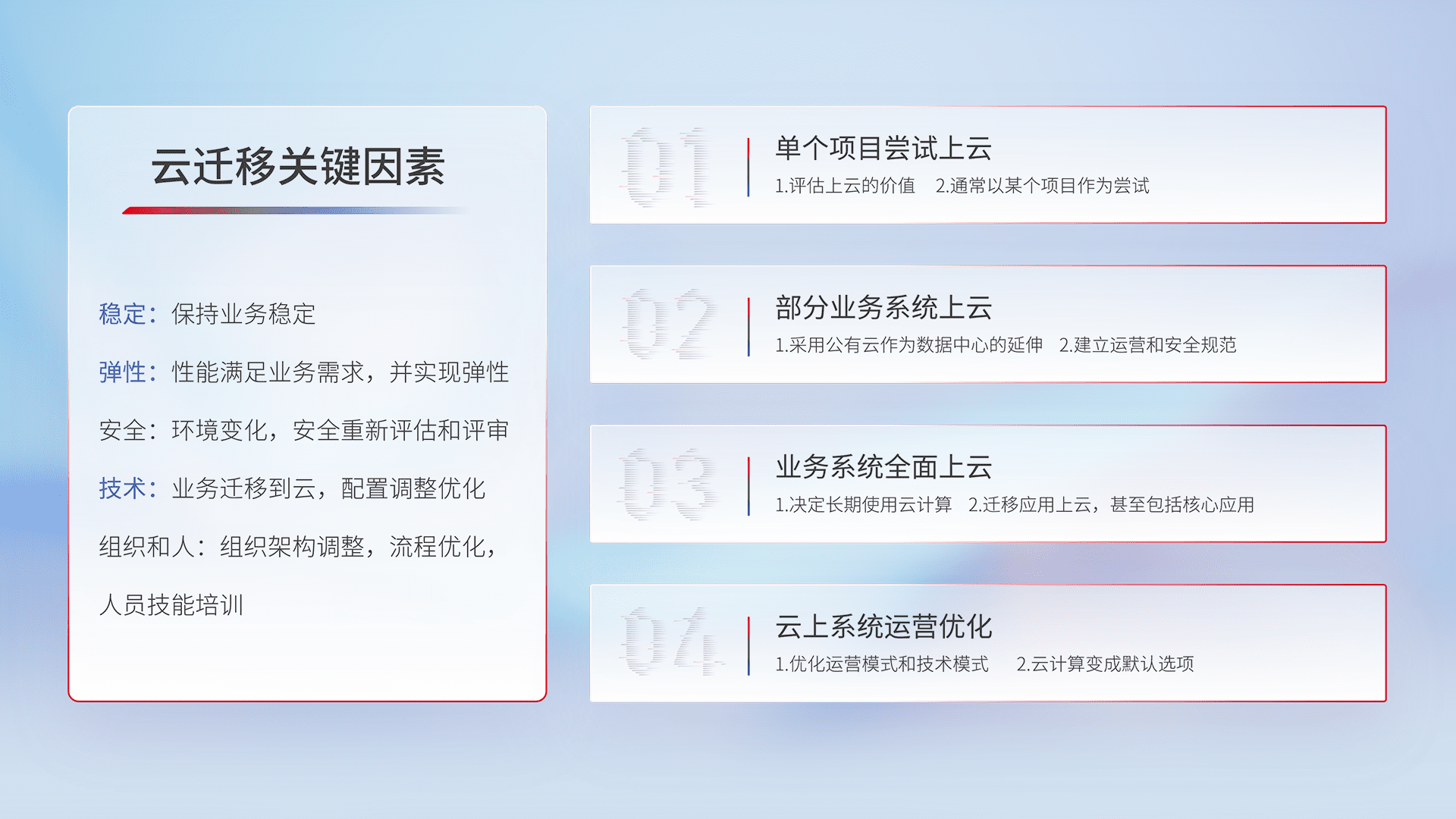 结合实际业务,,,从规划设计、、、云平台选型、、、、云原生改造、、、数据迁移、、集成交付,,,迁移全过程为客户识别最佳上云路径,,,,做好风险识别管理,,设计网络架构、、身份权限、、安全审计合规、、、操作审计、、、、日志审计、、、监控告警策略、、、、多站点容灾设计等,,,对云上基础设施进行整体规划,,,,提升IT治理水平,,,,以满足弹性、、高可用、、、高性能的需求。。