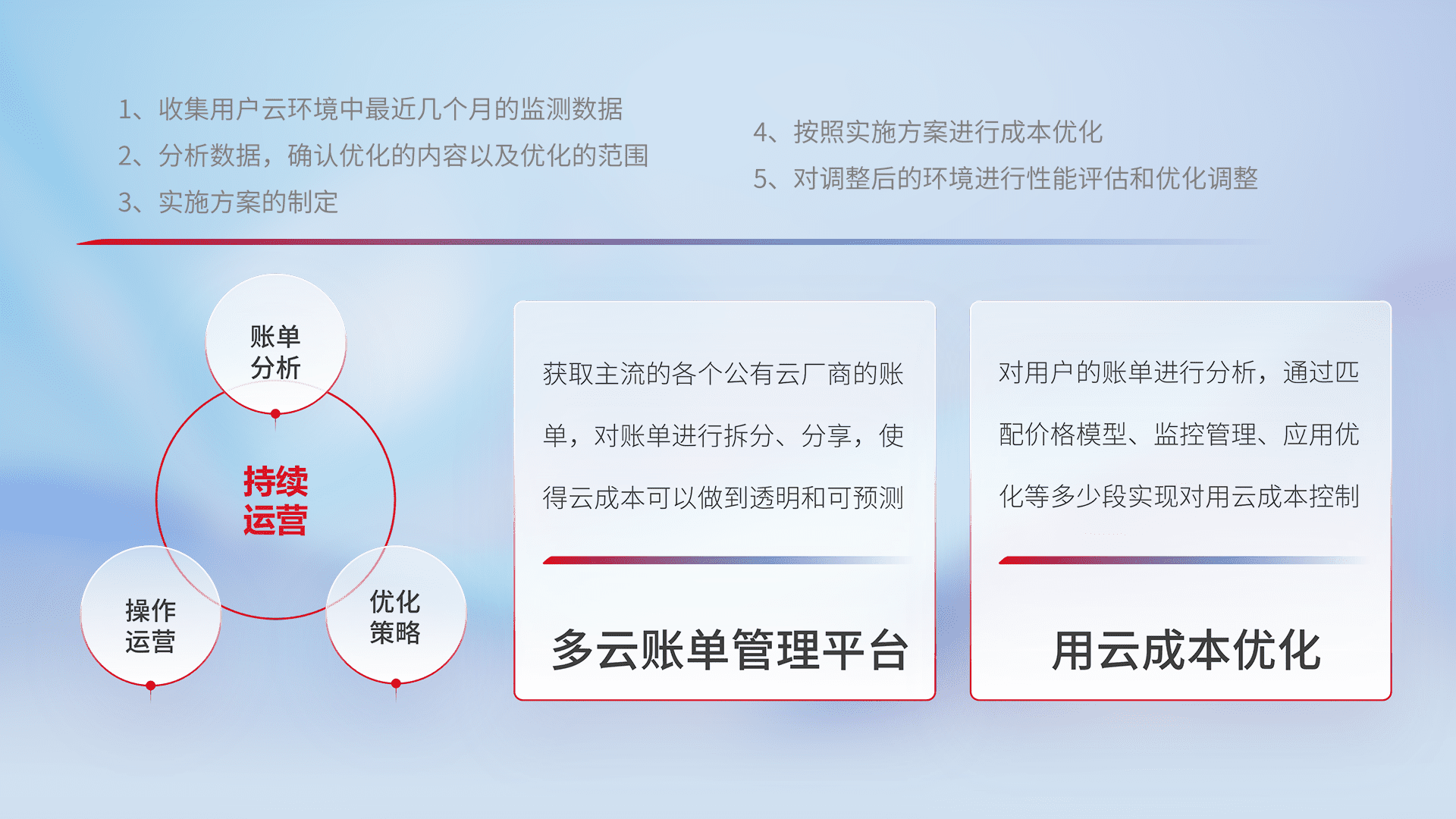 通过多云纳管,,,,以统一的资源数据模型把客户的云资源进行抽象和封装,,,进而实现对多云资源的统一操作,,保障云资源管理的可靠性、、稳定性与可用性。。。。量身定制化运维内容,,配置、、、开发运维、、、、补丁管理、、备份、、、监控、、认证和访问管理、、审计和日常巡检等,,保障在用云过程中的可靠度,,,,稳定度以及高可用率。。。。
